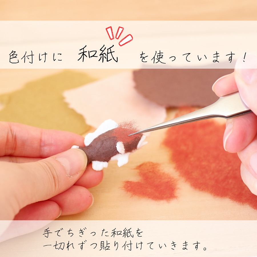 色付けに『和紙』を使ったこちらの作品は、「手でちぎったり切ったりした和紙を、立体物に貼り付ける」という、ちょっと珍しい手法で制作。
