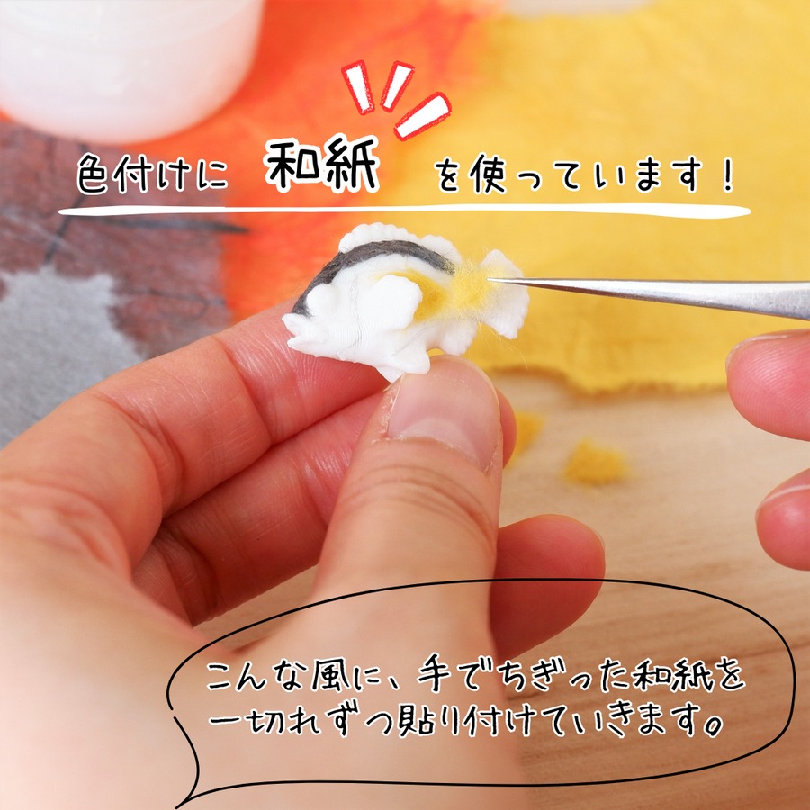 「和紙のちぎり絵の立体バージョン」といったイメージを思い浮かべていただくと、色付け方法がイメージしやすいでしょうか♪