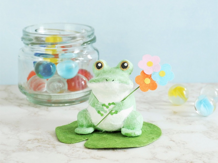 完成したカエルさんは、お部屋や玄関、机の上など、お好きな場所に飾ってお楽しみください。