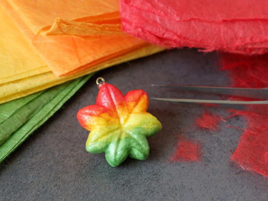 緑の葉から紅葉へと変わりゆく様子を、黄緑色から赤色まで4色の和紙を貼り付けることで、美しいグラデーションを表現しています。